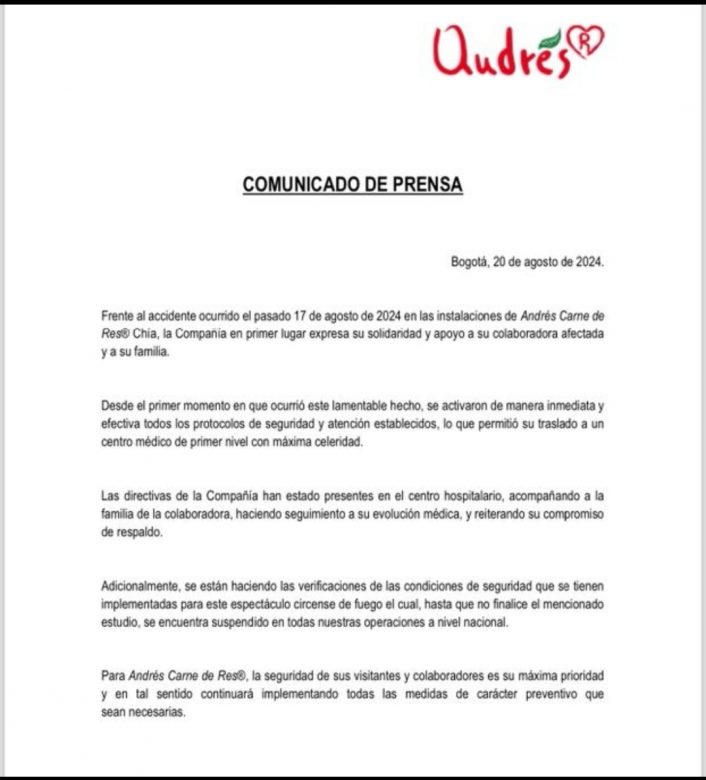 También, afirmaron que se están haciendo las verificaciones de las condiciones de seguridad que se tienen implementadas para este espectáculo circense de fuego, el cual, «hasta que no finalice el mencionado estudio, se encuentra suspendido en todas nuestras operaciones a nivel nacional».«Para Andrés Carne de Res, la seguridad de sus visitantes y colaboradores es su máxima prioridad y en tal sentido continuará implementando todas las medidas de carácter preventivo que sean necesarias», concluyeron.